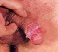 初起时,局部潮红,阴茎的皮肤发红、肿胀,自觉龟头有灼热和瘙痒感。翻开包皮,可见包皮内面及龟头充血糜烂、有渗液,甚至出血。继发感染后,可见小溃疡,有恶臭的乳白色脓性分泌物。如与内裤摩擦即感疼痛,导致患者常常活动不便。均伴有包皮过长患者,卫生习惯差,多见于性活跃的青年。